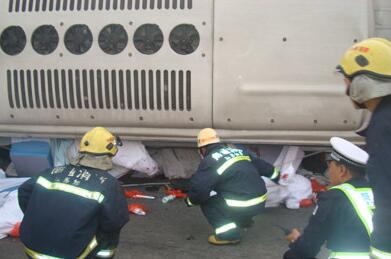 通過圖片我們可以看到,指揮員迅速組織兩組人員開展施救,一組人員利用雙利油壓千斤頂將客車頂起對被困人員進行搜救,另一組人員利用液壓破拆工具對變形的槽罐車車頭進行破拆,救援被困的兩名駕駛員,同時針對槽罐車泄露口進行堵漏并對泄露的液體進行稀釋。